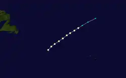 Ships first indicated the presence of a tropical storm southwest of Cabo Verde on September 5.[10] The system moved generally westward and intensified into a hurricane late the next day. Early on September 11, the storm peaked as a strong Category 2 hurricane with maximum sustained winds of 110 mph (175 km/h) as it began passing through the Lesser Antilles, first near Barbados and then between Saint Lucia and Saint Vincent several hours later. Thereafter, the hurricane turned northwestward and entered the Caribbean. Around 18:00 UTC on September 12, the cyclone passed just west of Anguilla while traversing the Anegada Passage and re-emerged into the Atlantic. The storm continued northwestward until curving northeastward on September 17. Late on September 19, the system transitioned into an extratropical cyclone about 95 mi (155 km) of the eastern tip of Nova Scotia. The remnants crossed Newfoundland before dissipating over the Labrador Sea on the following day.[3]