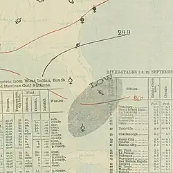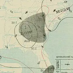 Parts of Louisiana experienced heavy rainfall. Plaquemine reported 4 in (100 mm) of precipitation in only a few hours, damaging local sugarcane crops.[22] In Lake Charles, rains flooded streets and caused losses to rice crops, while winds downed many telephone poles.[23] Similarly, the town of Jennings noted damage to rice crops, with losses totaling "many thousands", according to The Times-Democrat.[24] Farther east, New Orleans reported sustained winds up to 42 mph (68 km/h).[10] Precipitation generated by the storm in Mississippi led to a washout along the Yazoo and Mississippi Valley Railroad.[25] Elsewhere, winds and precipitation from the storm and its remnants spread across parts of the Mississippi Valley and Eastern United States.[10]