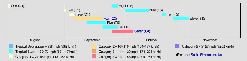 Seven September 25 – October 6 Category 4 hurricane 130 (215) 938 Southeastern United States (Georgia) $1.5 million 179 [29][31]