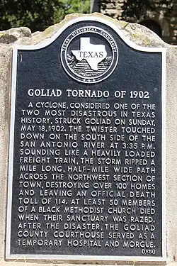 6. ^ "Details - Goliad Tornado of 1902 - Atlas Number 5175002207 - Atlas: Texas Historical Commission". atlas.thc.state.tx.us. Retrieved April 18, 2017.