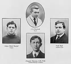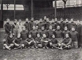 On February 9, 1907 the Western University of Pennsylvania Athletic Committee hired Yale graduate John A. Moorhead as head football coach for the 1907 season. Mr. Moorhead was originally hired as an assistant line coach on October 29, 1906.[11] Frank Rugh, former WUP player and 1904 Law School grad, was the assistant coach. When 1906 team captain Gil Miller became ill, Cal Marshall was appointed his replacement and did a commendable job. The team officially nominated him team captain for the 1907 season at the season ending banquet.[12] The Athletic Committee also hired Ed LaForce, the well known trainer of the Pittsburgh Pirates, for the 1907 football season.[13] The team lived in a new training house that was built next to campus. The prospects for a successful season were good as end Theodore Perry was the only starter who had graduated. Plus, the Athletic Committee reviewed the eligibility rules and determined that graduate students Jud Schmidt and Joe Edgar could play another season. The same committee then disqualified both players on November 4 for undisclosed reasons.[14] The committee put together a competitive ten game schedule. In its first season under head coach John A. Moorhead, the team compiled an 8–2 record, shut out eight of its ten opponents, and outscored all opponents by a total of 147 to 27.[15][16]