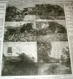 In New Orleans, the storm caused substantial damage, with many homes destroyed and ships wrecked.[17] Communication with the city was completely lost after most of the telegraph wires were downed. Around 3:00 pm on September 21, advisories from the New Orleans Weather Bureau ceased, leading to concerns over the state of the city. Prior to the communication loss, the Weather Bureau reported that waves along the Mississippi River banks were surpassing 3 ft (0.91 m) and water rise in New Orleans itself could reach unprecedented levels. Several lakes overflowed their banks as water from the Mississippi River back-flowed into them, flooding nearby lowlands.[18] The resulting floods, which inundated areas with upwards of 10 ft (3.0 m) of water,[3] were similar in scale to the flooding caused by Hurricane Katrina in 2005, nearly 100 years later. However, due to the lack of residential buildings in the area at the time, the flooding caused far less destruction than that of Katrina.[19] A report falsely claimed that the city's French Quarter was "swept away". A total of 306 coal barges sank off the coast of New Orleans and Lobdell (West Baton Rouge Parish), incurring over $1 million in losses.[17] Nearly every sugar cane plantation between New Orleans and Baton Rouge sustained damage, resulting in at least $1 million in losses.[20]