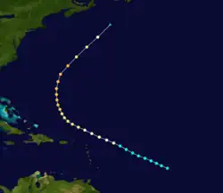 A tropical wave became a tropical depression on September 13 about 450 mi (725 km) northeast of Antigua and Barbuda.[4] The depression moved just north of due west and intensified into a tropical storm early the next day. On September 15, the cyclone turned north-northeastward and intensified into a hurricane early on September 18, shortly after curving northeastward.[2] The hurricane peaked with maximum sustained winds peaked at 85 mph (137 km/h) and a minimum barometric pressure of 1,000 mbar (30 inHg), both estimates based on ship observations.[4] Late on September 20, the cyclone turned eastward and weakened to a tropical storm. The system transitioned into an extratropical cyclone several hours later about 340 mi (545 km) west-southwest of the northwesternmost islands of the Azores. The extratropical remnants dissipated shortly thereafter.[2]