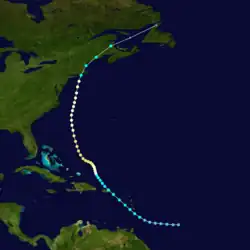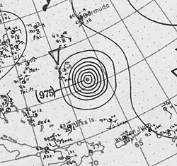 On September 17, the eleventh tropical storm was first detected about 950 mi (1,530 km) east of Barbados. It headed west-northward, strengthening into a hurricane on September 19, before passing well north of the Lesser Antilles. The storm became a Category 3 hurricane early on September 22,[2] and shortly thereafter peaked with maximum sustained winds of 120 mph (195 km/h) and a minimum barometric pressure of 975 mbar (28.8 inHg), based on data from ships and historical weather maps.[4] It turned northeastward and passed by Bermuda on September 24. The storm then weakened significantly and transitioned into an extratropical cyclone on the same day approximately 200 mi (320 km) southeast of Sable Island.[2] Another extratropical cyclone soon absorbed the remnants of this storm.[4]