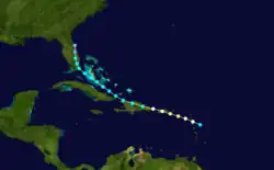 A strong tropical storm was first observed just east of Guadeloupe early on August 21. The cyclone moved west-northwestward, striking or passing near the island and intensifying into a hurricane. Early the next day, the system strengthened into a Category 2 hurricane and peaked with maximum sustained winds of 110 mph (180 km/h),[2] based on a barometric pressure observation of 980 mbar (29 inHg) in San Juan, Puerto.[4] Shortly thereafter,[2] the small diameter hurricane struck Puerto Rico and crossed the island from Naguabo to Aguada.[49] Late on August 22, the hurricane made landfall near Punta Cana, Dominican Republic, with winds of 75 mph (121 km/h). The cyclone quickly weakened to a tropical storm early the next day, several hours before re-emerging into the Atlantic near Port-de-Paix, Haiti. Continuing northwestward, the storm passed just west of the Bahamian islands, before making landfall near Cutler Bay, Florida, with winds of 45 mph (72 km/h) around 08:00 UTC on August 25. The cyclone turned northward over Florida and weakened to a tropical depression early on the following day, shortly before dissipating just offshore New Smyrna Beach.[2]
