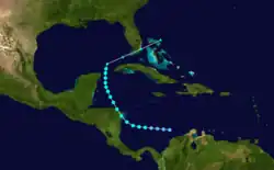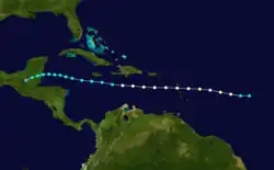 On August 27 at 12:00 UTC, a tropical storm was observed about 800 mi (1,285 km) east of Barbados. It strengthened into a hurricane about 12 hours later. The storm attained its peak intensity around the time it struck Dominica with maximum sustained winds of 80 mph (130 km/h) and a minimum barometric pressure of 986 mbar (29.1 inHg) early on August 28,[2] with the former being based on the latter, which was observed at Roseau.[4] This fast-moving hurricane tracked westward through the Caribbean and weakened to a tropical storm on August 30 while south of Haiti's Tiburon Peninsula. The cyclone weakened to winds of 45 mph (72 km/h) by the following day, but re-strengthened somewhat prior to its landfall in northern Belize with winds of 60 mph (97 km/h) on September 1. The storm moved west-southwestward into Guatemala and weakened, falling to tropical depression intensity on September 2 and dissipating shortly thereafter.[2]