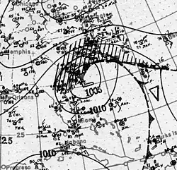 On May 13, a tropical depression formed about 60 mi (95 km) south of Trinidad, Cuba. It quickly crossed the island and moved over the Straits of Florida. The cyclone strengthened to a minimal tropical storm on May 14 and soon made landfall near Key Vaca, Florida, with winds of 40 mph (65 km/h). Around 06:00 UTC the storm struck the Florida mainland near Cape Sable and initially moved north-northwestward across the state.[2] Based on observations from Tampa late on May 14, the storm's minimum barometric pressure is estimated at 1,004 mbar (29.6 inHg).[4] The cyclone turned northeastward on May 15. It transitioned to an extratropical cyclone over eastern Virginia on the following day. The remnants briefly re-emerged over the Atlantic, before striking New England and dissipating over Maine on May 17.[2] Initially, the cyclone was not included in the Atlantic hurricane database.[4]