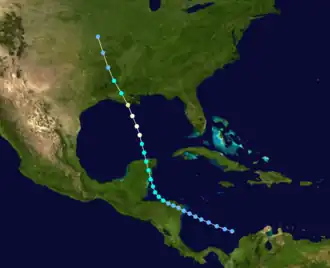 In mid-September, a trough moved across the central Caribbean Sea and into the vicinity of the Colombian islands. Becoming more organized, it developed a closed circulation on September 16,[1] and as such was classified as a tropical depression at 0600 UTC that day. For much of its early existence the depression remained weak, with winds remaining at 35 mph (55 km/h) and a minimum barometric pressure below 1,005 mb (1,005 hPa; 29.7 inHg).[1] The weak disturbance later made landfall at that intensity on the Mosquito Coast near the border of Honduras and Nicaragua by 0600 UTC on September 18. The small system gained intensity as it moved over Honduras, attaining tropical storm strength on September 19 prior to entering the Gulf of Honduras near Trujillo.[1][2] In the Gulf of Honduras, the tropical storm slightly intensified to maximum sustained winds of 50 mph (80 km/h) on September 20, and later made landfall on the Yucatán Peninsula as it accelerated towards the north-northwest.[2] Despite initially being reported to have maintained intensity across the peninsula, a reanalysis of the storm determined that it had weakened to minimal tropical storm strength, before entering the Gulf of Mexico late on September 20.[1]