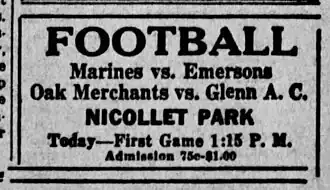 15. ^ "Marines Nose Out Emersons by 7–2 Score: North Side Team Gives League Team Scars in 1st, 4th Quarters," Minneapolis Tribune, Nov. 19, 1923, p. 8.