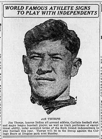- ^ a b "Independents Sign Jim Thorpe: Famous Indian Grid Star Reports for Practice at Douglas Park Wednesday," Davenport Daily Times, Sept. 22, 1924, p. 14.