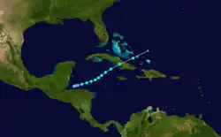 The season's next cyclone developed from over the northwestern Caribbean Sea from a broad low pressure area near the Bay Islands Department of Honduras on October 16.[4][5] Moving east-northeastward, the system strengthened into a tropical storm several hours later.[5] Early on October 17, the system peaked with winds of 45 mph (75 km/h), based on a ship observation of a minimum barometric pressure of 999 mbar (29.5 inHg).[4] Curving northeastward, it made landfall near Santa Cruz del Sur, Camagüey Province, late on October 18 at the same intensity. After crossing Cuba, the storm accelerated and moved through the Bahamas early the following day, striking the island of Acklins. By 06:00 UTC, the system was absorbed by a cold front while located about 105 mi (170 km) north-northeast of Mayaguana.[5]