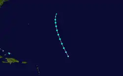 A low pressure area developed into a tropical storm about 835 mi (1,345 km) east-northeast of Barbuda early on September 23.[4][5] The system moved northwest, and by 12:00 UTC on September 24, it strengthened into a Category 1 hurricane. Late on September 25, the cyclone intensified into a Category 2 hurricane. A ship recorded a pressure of 971 mbar (28.7 inHg) on September 26. Because this was measured within the storm's radius of maximum sustained winds, the hurricane's minimum barometric pressure was estimated to have been 967 mbar (28.6 inHg). Based on the pressure-wind relationship, the system peaked with maximum sustained winds of 110 mph (175 km/h). Thereafter, it curved northeastward on September 27, shortly before weakening to a Category 1 hurricane. Early on September 28, the hurricane became extratropical about 360 mi (580 km) south-southeast of Sable Island. However, the extratropical storm existed until October 1, when it dissipated well north of the Azores.[5]