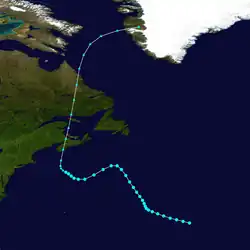 On September 16, a tropical storm with winds of 40 mph (64 km/h) developed out of a frontal boundary about 860 mi (1,385 km) southwest of the northwesternmost islands of the Azores.[2][3] Moving slowly towards the northwest,[3] gales were reported by ships in the region as the cyclone slowly intensified.[2] On September 20, the storm began to move towards the southwest. The system reached peak intensity on September 21, with winds of 65 mph (105 km/h), before transitioning into an extratropical cyclone about halfway between Bermuda and Nova Scotia as it recurved northwards on September 23. The extratropical cyclone later made landfall on Nova Scotia the following day, before dissipating over southern Greenland on September 26.[3] Sustained winds in Atlantic Canada peaked at 29 mph (47 km/h) on Resolution Island in Nunavut.[2]
