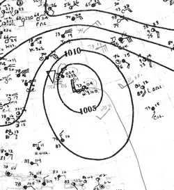 A tropical depression formed on May 5 in the south-central Caribbean Sea. Moving slowly northeast, the system became a tropical storm the next day and gradually strengthened before making landfall just west of Baní in the Dominican Republic's modern-day Peravia Province with winds of 45 mph (72 km/h) on May 7. Within six hours, the storm emerged into the western Atlantic on May 8 and continued to strengthen. The system reached its peak intensity of 65 mph (105 km/h) on May 9 while centered south-southwest of Bermuda. The diffuse system later transitioned into an extratropical cyclone the same day, later dissipating on May 11 well to the northwest of Bermuda after merging with a frontal boundary.[2][3] Heavy rainfall was reported in far eastern Cuba and the Dominican Republic, with the latter recording over 6 in (150 mm) of precipitation in 12 hours.[9]