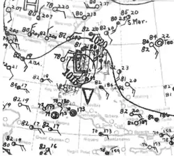 Although the storm affected several Caribbean islands, the Turks and Caicos, and the Bahamas, preparations there, if any, were unclear.[8] Residents across Puerto Rico boarded up windows and secured roofs in anticipation of damaging winds.[12] Governor Robert Hayes Gore placed the Hurricane Relief Organization and Red Cross on standby.[13] As the storm neared Florida, the United States Weather Bureau—later the National Weather Service—posted storm warnings between Miami and Titusville. These were later extended to include the west coast of the state from Punta Rassa to Tarpon Springs.[8] At the time, forecasters were unaware that the storm was of hurricane status; this unawareness extended to the storm's passage over the Gulf of Mexico. Forecasters only issued storm warnings for part of the Texas coast, including the cities of Brownsville and Freeport.[8]