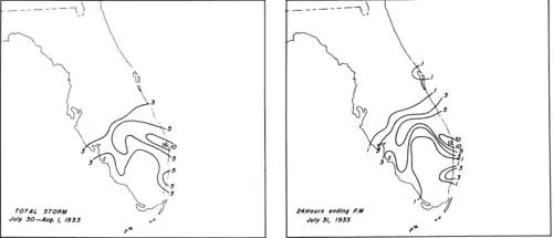 33. ^ a b c "Storm Center Goes Inland Near Stuart Early Sunday Afternoon". Palm Beach Post. July 31, 1933. p. 1. Retrieved August 31, 2022 – via Newspapers.com. Free access icon