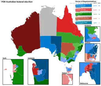 The 1934 Australian federal election was held in Australia on 15 September 1934. All 74 seats in the House of Representatives, and 18 of the 36 seats in the Senate were up for election. The incumbent United Australia Party led by Prime Minister of Australia Joseph Lyons formed a minority government, with 33 out of 74 seats in the House.