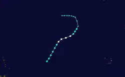 In 2012, as part of their ongoing Atlantic hurricane reanalysis project, the National Hurricane Center identified a previously undocumented hurricane. On January 1, an extratropical cyclone formed over the northeastern Atlantic along the tail-end of a cold front. The cyclone initially moved east but soon turned south then west by January 3. Warm air coalesced in the vicinity of the storm, and the frontal boundary dissipated,[5] leading to the formation of a tropical storm by 18:00 UTC on January 3 about 850 miles (1,370 km) southwest of the Azores.[6] It is possible, however, that the system existed as a subtropical cyclone before transitioning into a fully tropical entity.[5] The storm temporarily embarked on a more westerly course before banking south-southwest, through which time it intensified into a Category 1 hurricane, peaking with winds of 80 mph (130 km/h). Gradual weakening ensued as the cyclone entered the deep tropical Atlantic east of the Leeward Islands, with its final point recognized at 18:00 UTC on January 6.[5][6]