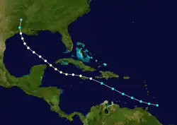 Around 00:00 UTC on August 10,[6] a rapidly-moving tropical storm was identified southeast of Barbados.[5] It tracked into the Caribbean Sea and intensified into the season's second hurricane, with the center of the storm narrowly missing Jamaica to the north late on August 11. Observations from Grand Cayman indicate that it strengthened into a Category 2 hurricane,[5] reaching peak winds of 100 mph (160 km/h) that day, before the system slowly weakened. It moved through the Yucatán Channel and into the Gulf of Mexico, making a later landfall just west of Cameron, Louisiana, at 01:00 UTC on August 15 with winds of 75 mph (121 km/h). The cyclone curved north-northeast and was last observed as a weak tropical depression along the ArkansasLouisiana border at 12:00 UTC on August 15.[6]