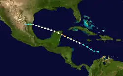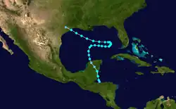 A tropical depression formed over the Gulf of Honduras around 18:00 UTC on October 10 and quickly intensified into a tropical storm six hours later.[6] The system moved northwest and struck San Pedro Town, Belize, with winds of 45 mph (72 km/h) at 08:00 UTC on October 11.[5] It weakened to a tropical depression while moving across the Yucatán Peninsula but regained tropical storm intensity and reached peak winds of 60 mph (97 km/h) after emerging into the Gulf of Mexico. The cyclone turned east toward the Florida Keys but began backtracking on October 15, embarking on a west-northwest trajectory that brought it ashore Galveston Island, Texas, around 13:00 UTC on October 17. It maintained winds of 45 mph (72 km/h) at the time. Once inland, the storm continued west-northwest and was last analyzed northwest of Houston at 18:00 UTC.[5][6]