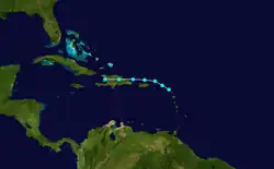A strong tropical storm with peak winds of 70 mph (110 km/h) was first identified just west of Antigua and Barbuda at 06:00 UTC on August 8,[6] though it may have developed days earlier in the absence of a reliable data network. The rapidly-moving system curved west, passing north of Puerto Rico before striking the northeastern coastline of the Dominican Republic as a 50 mph (80 km/h) cyclone at 09:00 UTC on August 9.[5] The storm continued across Hispaniola and dissipated after 18:00 UTC that day, though the remnant tropical wave continued on to impact Cuba on August 10.[5][6]