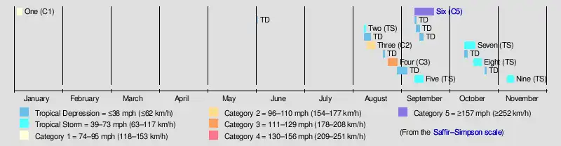 The season's activity was reflected with an accumulated cyclone energy (ACE) rating of 78 units,[4] below the 1931–1943 average of 91.2.[2] ACE is a metric used to express the energy used by a tropical cyclone during its lifetime. Therefore, a storm with a longer duration will have high values of ACE. It is only calculated at six-hour increments in which specific tropical and subtropical systems are either at or above sustained wind speeds of 39 mph (63 km/h), which is the threshold for tropical storm intensity. Thus, tropical depressions are not included here.[4]