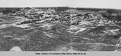 The rural location of the event has left a lot of the facts up for speculation. Despite this, it is believed that the tornado began forming five miles northeast of the town near the border of Caddo Parish and Miller County, Arkansas. The tornado moved south before changing direction, touching down, and striking the town from the east at 9:45 p.m. The tornado destroyed the entire southeastern portion of the town or what was once known as "Supply House Row", knocking over power lines and leaving an estimated 200 yard path of decimation in its wake. It is stated that the tornado only lasted two minutes, but was followed by heavy rains that would impede the search for victims amongst the rubble.[2] Only one tornado was confirmed. Despite the damage to power lines, the telephone lines were fully operational and residents began phoning nearby villages for assistance.