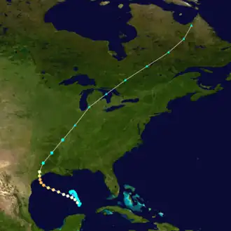 In the middle of September, disturbed atmospheric conditions from a trough or tropical wave existed over the western Caribbean Sea and gradually coalesced near western Cuba on September 15–16. Even so, surrounding surface weather observations did not suggest that an area of low pressure had generated, but gradual organization continued until a tropical depression formed on September 17 in the central Gulf of Mexico about 120 miles (193 km) north of the Yucatán Peninsula.[1] Operationally, the United States Weather Bureau failed to detect a tropical cyclone in the Gulf of Mexico until a day later.[2] After formation, the system initially moved northwestward, a heading that continued early on September 18. At that time, the system became a tropical storm more than 300 mi (483 km) to the south-southeast of New Orleans, Louisiana.[3]