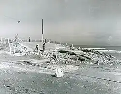 Men from the Works Progress Administration doing emergency repair to the road at the end of the Galveston, Texas Seawall.