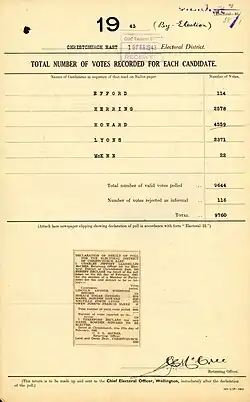 - ^ "By-Election Totals". The Evening Post. Vol. CXXXV, no. 40. 17 February 1943. p. 6. Retrieved 16 November 2011.