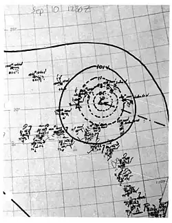 Another short-lived tropical storm was first identified about 195 mi (314 km) east of Guadeloupe by 12:00 UTC on September 9. Data from a reconnaissance aircraft indicated the storm intensified slightly to attain winds of 60 mph (97 km/h) by early the next day,[2] in spite of a poorly defined circulation center.[3] It tracked northwest and then north, passing within 130 mi (210 km) of Bermuda before dissipating around 18:00 UTC on September 12.[2]