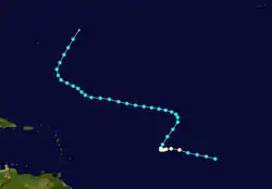 On August 28, a tropical wave developed into a tropical depression near Cape Verde. After moving west-southwestward, it turned to the northwest, intensifying into a tropical storm on August 31 and into a hurricane on September 2. Passing northeast of the Lesser Antilles, Carol rapidly intensified to Category 5 intensity, reaching peak winds of 160 mph (260 km/h) on September 3, making it the strongest hurricane of the season.[3][8] It gradually weakened, bypassing Bermuda on September 6 and producing high waves.[8][16] Carol later turned to the north-northeast, brushing Cape Cod and causing boating accidents across New England. Four people were killed in the region.[8][17] Fishing losses totaled around $1 million (1953 USD, $11.8 million 2025 USD).[3]