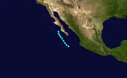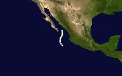 A tropical cyclone first formed on September 13 near Western Mexico (in the extreme southern Gulf of California) while generating winds of 30–40 mph (50–65 km/h). It traveled north-northeastward[3] and Three was upgraded into a hurricane on September 14 while reaching its maximum sustained wind speed of 85 mph (135 km/h).[6] After turning east-northeast, Hurricane Three attained its peak pressure of 982 mbar (29.0 inHg).[3] The storm held on to its wind speed, until September 17, when the storm dissipated.[6] The remnants of the storm deluged the Mexican coast with rain, especially in Sinaloa. Winds of 45 mph (70 km/h) were reported in Mazatlan on land; however, no damage was recorded.[3]