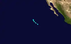 Ships reports from the Hawaiian Islands to Panama indicated that an area of disturbed weather formed just west of the Revillagigedo island group. Initially, evidence of closed wind circulation was insufficient to warrant an upgrade into a tropical disturbance. By the afternoon, pressures in the region began to fall. By that night, it was estimated to have developed winds of 40 mph (65 km/h).[3] A tropical storm formed on September 9;[6] meanwhile, ship reports indicated a pressure of 1,001 mbar (29.6 inHg) and sustained winds of 50 mph (85 km/h).[3] Maintaining peak intensity for a day, the low moved northwest before dissipating on September 10 as[6] barometric pressures began to rise. The remnants of the storm later brought rain to Central California on September 15.[3]