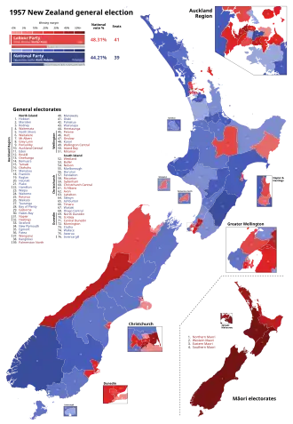 The 1957 election saw the governing National Party defeated by a narrow two-seat margin. It had previously held a ten-seat majority. National won a total of thirty-nine seats, while the Labour Party won forty-one. In the popular vote, National won 44% to Labour's 48%. The Social Credit Party won 7% of the vote, a drop from its previous result of 11%. It still won no seats.