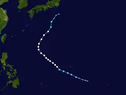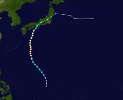 On May 29, Super Typhoon Phyllis attained a peak of 185 miles per hour (298 km/h), the strongest typhoon on record in May at the time.[4] Phyllis remained over open waters, and dissipated on June 2, southeast of Japan.
