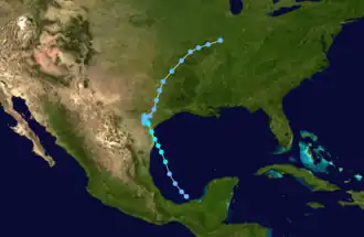 The depression gradually strengthened, and by 0600 UTC on June 23, it reached tropical storm status.[2] Over Texas, airborne radars and the Dow Chemical Company radar in Freeport indicated curved convective banding associated with the storm. Though no wall cloud was reported, the Kelly Air Force Base reported a cloud center.[1] The storm continued to intensify, peaking with winds of 60 mph (97 km/h) by 0000 UTC on June 24.[2] At 0400 UTC that day, the tropical storm made landfall near Corpus Christi, Texas.[1][2] After moving inland, the storm quickly weakened back to a tropical depression. Over the following 24 hours, the depression executed a small cyclonic loop over southern Texas. On June 26, the depression accelerated to the north-northeast, and eventually dissipated over northern Illinois on June 29 at 0000 UTC.[2]