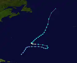 A stationary front across the central Atlantic Ocean led to the development of a low pressure area by November 16, northeast of the Lesser Antilles. A day later, it is estimated that a tropical depression developed, although due to the system's large size, it was possible it was a subtropical cyclone. The depression moved northeastward and slowly intensified, based on observations from nearby ships. On November 19, the depression strengthened into a tropical storm. The storm strengthened to reach peak winds of 60 mph (97 km/h) on November 20. By that time, a cold front was approaching the storm, causing the storm to transition into an extratropical cyclone on November 21; later that day, the front absorbed the former tropical storm.[6]