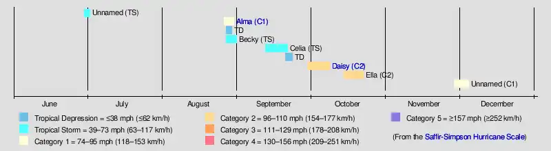 | Daisy | September 29 – October 7 | Category 2 hurricane | 105 (165) | 963 | Leeward Islands, Bermuda, New England, Atlantic Canada | >$1.1 million | 8 (24) | |||