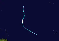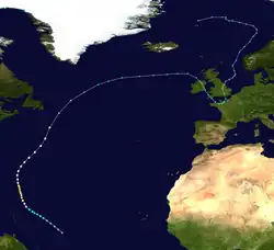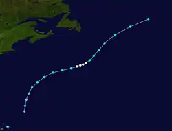 As early as September 8, ships north of Puerto Rico reported a weak circulation. Drifting northward,[5]: 131  the system developed tropical depression by 12:00 UTC on September 9, while situated about 355 mi (570 km) northeast of Turks and Caicos Islands.[2] The cyclone was subtropical in nature, fueled by both latent heat and instability from contrasting cool and warm air masses. While passing Bermuda later on September 10, sustained wind speeds of 25 mph (40 km/h) and decrease in barometric pressure were observed.[5]: 131  The system moved east-northeastward and strengthened into a tropical storm late on September 10. The cyclone intensified further and reached hurricane status early on September 12, peaking with maximum sustained winds of 80 mph (130 km/h) and a minimum barometric pressure of 990 mbar (29.23 inHg).[2] Around that time, the Freiburg observed winds of 78 mph (126 km/h).[5]: 131  Thereafter, the system weakened to a tropical storm about 24 hours later and accelerated to the northeast ahead of a cold front. Around 12:00 UTC on September 14,[2] the storm was absorbed by a large extratropical cyclone while located about 725 mi (1,167 km) north-northwest of Corvo Island in the Azores.[7]: 198