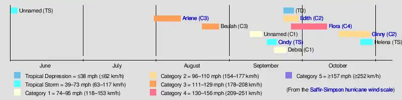 Tropical cyclogenesis began early, an unnamed tropical storm developing on June 1. However, activity ceased for nearly two months, before Arlene formed on July 31. Another system formed in August, Hurricane Beulah. September was much more active, with Cindy, Debra,[2] an unnumbered tropical depression.[7]: 270–271  Edith, and Flora all developing in that month. Flora was the most intense tropical cyclone of the season, peaking as a Category 4 hurricane with winds of 150 mph (240 km/h) and a minimum barometric pressure of 933 mbar (27.55 inHg). There were two other system in October, Hurricane Ginny and Tropical Storm Helena; the latter dissipated on October 30.[2]