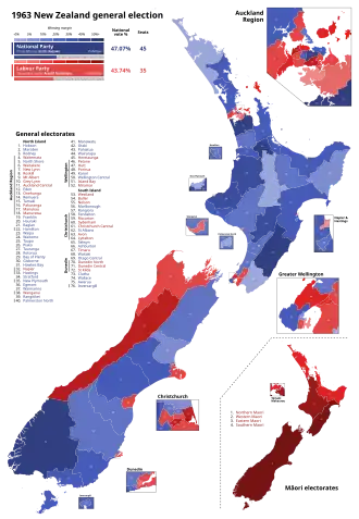 The 1963 election saw the governing National Party retain office by a ten-seat margin. It had previously held office by a twelve-seat margin. National won a total of forty-five seats, while the Labour Party won thirty-five. In the popular vote, National won 47.1% to Labour's 43.7%. The Social Credit Party won 7.9% of the vote, but no seats, although their leader Vernon Cracknell came close to winning Hobson, but ultimately lost due to special votes. Four of their candidates also missed the nomination deadline. One political analyst, Professor Robert Chapman, called it "the no change election".[3][5]