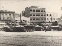 The Army had a marginal participation in the containment of the insubordinates. The disciplinary situation in the Land Force was better, and its soldiers did not join the revolt.[127] The support was requested by the Navy Minister to the Ministry of War and included twelve tanks and 500 soldiers[125] of the Mechanized Reconnaissance Regiment and the 1st Army Police Battalion,[i] the latter with the field presence of Colonel Domingos Ventura.[121] Participation was requested for both offensives, and by the afternoon the entire block was closed by the Army.[126] However, the official position of the War Ministry was that the problem "at present, is restricted to the purview of the Navy Ministry."[121]