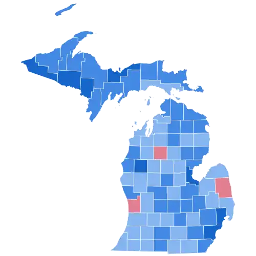 Michigan was won by incumbent President Lyndon B. Johnson (DTexas), with 66.70% of the popular vote, against Senator Barry Goldwater (RArizona), with 33.10% of the popular vote.[4][5] As of the 2024 presidential election, this is the last election in which Livingston County, Allegan County, Antrim County, Grand Traverse County, Midland County, Ionia County, St. Joseph County, Barry County, Newaygo County, Hillsdale County, Emmet County, and Otsego County voted for the Democratic candidate.