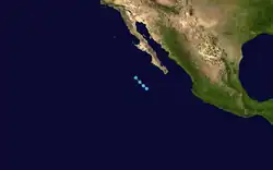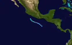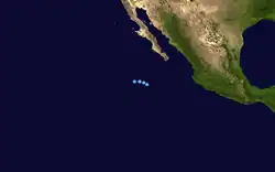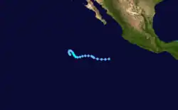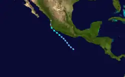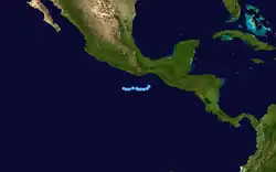 Six days after Joyce's dissipation, a tropical depression formed north of the Intertropical Convergence Zone on the evening of August 25.[8][9] The storm was then named Tropical Depression Sixteen-E. It took an extended amount of time, about three days before it intensified into a tropical storm.[10] The storm was designated as Tropical Storm Kirsten.[11]