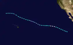 On the evening of August 2, a tropical storm formed south of Mexico, skipping tropical depression strength. It initially went west-northwest until the evening of August 4 when it reached Category 1 hurricane status. Blanca eventually leveled off as it headed westward. On the morning of August 7, Blanca weakened into a tropical depression after weakening into a tropical storm two days later. During the afternoon of that day, Blanca crossed into the Central Pacific as a 30-mile per hour tropical depression. Blanca regained tropical storm status on August 9 as it went northwestward. Blanca continued stair-stepping as it dissipated on August 12 while northwest of Honolulu, Hawaii. As Blanca never affected land, there were no reports of damages or deaths. Blanca set a record for the farthest traveling storm that formed in the Eastern Pacific by traveling 4,300 miles during its life. (1957's Hurricane/Typhoon Della traveled 5,000 miles, but formed in the Central Pacific.)[3]