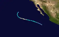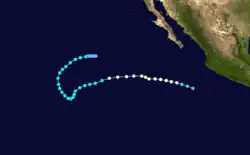 Tropical Depression Eleven formed due south of La Paz, Mexico on September 5. The next morning, the depression became the season's sixth tropical storm and was named Francesca. Francesca entered a period of rapid strengthening for six hours as the storm's winds increased by 35 mph (56 km/h) and became the season's sixth hurricane. After this period of strengthening, Francesca leveled out and remained a hurricane until the morning of September 9 when it weakened prior to a southward dive as the result of interacting with nearby Tropical Storm Gretchen.[5] Francesca continued to trek southward until the evening of September 11, when the storm very sharply recurved. Subsequently, Francesca weakened into a tropical depression as it went due east for 36 hours. Francesca degenerated into a remnant low on the morning of September 16. Francesca was the longest lived hurricane of the season by lasting eleven days. Wave action from Francesca and Hurricane Helga caused beach erosion throughout California.[6]