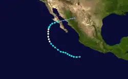 After it was upgraded, Kirsten swept the Baja California Peninsula, mainly Baja California Sur. Kirsten made landfall again about halfway between Los Mochis and Ciudad Obregón, Mexico. Kirsten weakened, but maintained tropical storm status before making landfall in Sinaloa.[9] While making landfall, Kirsten made extensive damage in the peninsula. The winds of Kirsten were up to 50 knots (58 mph) while making landfall.[10][11] Kirsten degenerated into a remnant low on September 28 and dissipated on September 29 near Navojoa.[9]