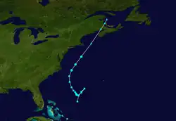 A tropical wave moved through the northeastern Caribbean on October 10, with a large area of associated thunderstorms. The wave interacted with a stalled frontal boundary, developing a broad circulation by October 13 to the northeast of the Bahamas. A day later, the system developed into a subtropical storm – its classification was because the system was co-located with a trough. There was another area of convection along the front northeast of the subtropical storm, which accelerated northeastward. Meanwhile, the subtropical storm turned westward. It had a small circulation with thunderstorms sheared north of the center, which gradually became more organized. On October 17, an approaching front turned the storm northward and later northeastward. On the same day, the subtropical storm transitioned into a tropical cyclone. On the next day, the storm attained peak winds of 60 mph (97 km/h), before it transitioned into an extratropical cyclone over Atlantic Canada, where it was ultimately absorbed by the cold front on October 19.[3]