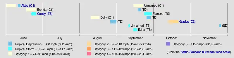 The 1968 Atlantic hurricane season was a below average hurricane season during which only nine nameable storms developed. The season officially began on June 1 and lasted until November 30, dates which conventionally delimit the period of each year when most tropical cyclones form in the Atlantic basin. Of the named storms, five strengthened into hurricanes; none however intensified into a major hurricane.[nb 1] Only four other seasons since the start of the satellite era—1972, 1986, 1994, and 2013—did not feature a major hurricane. The first system, Hurricane Abby, developed in the northwestern Caribbean on June 1. Abby moved northward and struck Cuba, bringing heavy rainfall and flooding to western portions of the island. Making landfall in Florida on June 4, Abby caused flooding and spawned four tornadoes, but left behind little damage. Overall, the hurricane resulted in six deaths and about $450,000 (1968 USD) in damage.[nb 2] In late June, Tropical Storm Candy brought minor flooding and spawned several tornadoes across portions of the Southern United States. Overall damage from the cyclone reached approximately $2.7 million. 1968 featured two simultaneously active tropical storms during the month of June, a phenomenon that would not occur again until 2023.[2]